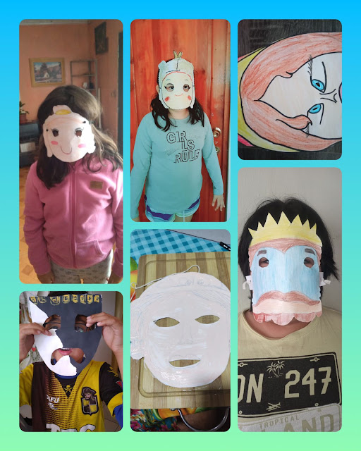 Fotografías evidencia de las máscaras creadas por los alumnos del 3° A con motivos  griegas y romanas .